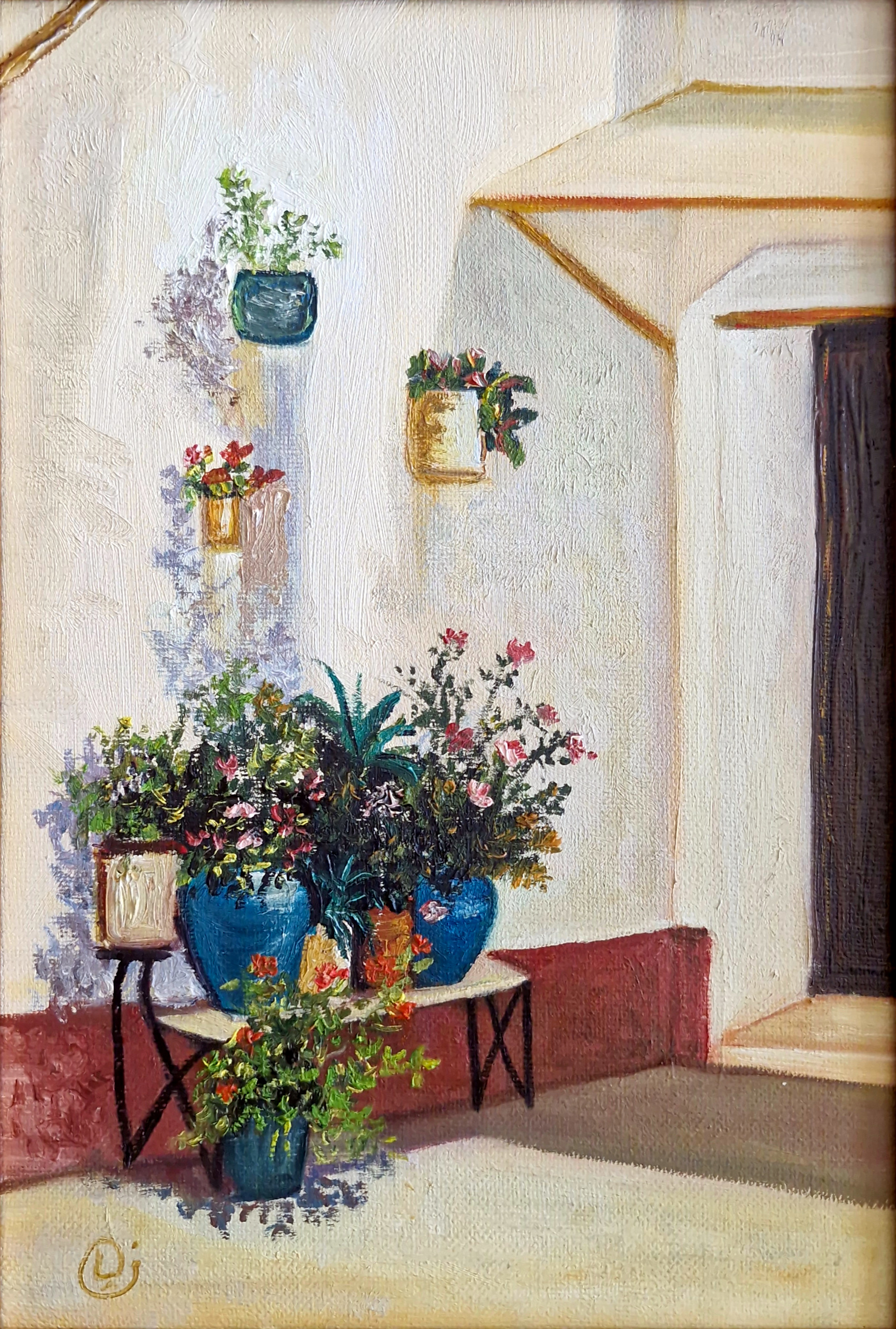 This painting, titled My Father, represents the house I grew up in. It depicts various vibrant plants and flowers in pots placed against a wall. The shadows on the wall and the details of the pots reflect the warm and peaceful atmosphere of the home. The yellowish light under the ceiling in the upper corner emphasizes the sunny and bright nature of the place. The overall composition of the painting brings back precious memories of my childhood and the moments I shared with my family. This painting is not just a depiction of a place but also a reflection of the emotions and memories from that period.